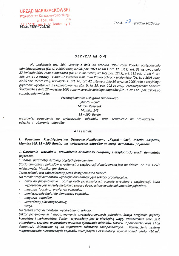Firma Kapral-Car, która jest obecnie liderem na rynku usług polegających na kasacji samochodów. Zajmuje się profesjonalną kasacją różnych aut. Swoje usługi proponuje tym, którzy z jakiegoś powodu chcą pozbyć się swojego samochodu. Jest to działająca w pełni legalnie stacja demontażu pojazdów. Kasacja aut kończy się zawsze przekazaniem klientowi wszystkich dokumentów, jakie są niezbędne. Autokasacja wykonywana jest przez firmę od ponad piętnastu lat. Wieloletnie doświadczenie jest gwarantem wysokiej jakości usług. Jeśli interesuje Cię aut kasacja, wybierasz zawsze usługi na naprawdę wysokim poziomie, chcesz mieć pewność, że wszystko odbędzie się w świetle obowiązującego prawa, nie czekaj. Firma Kapral-Car to doskonały wybór, na jaki możesz się zdecydować. To firma , która zadowoli nawet najbardziej wybrednych klientów.