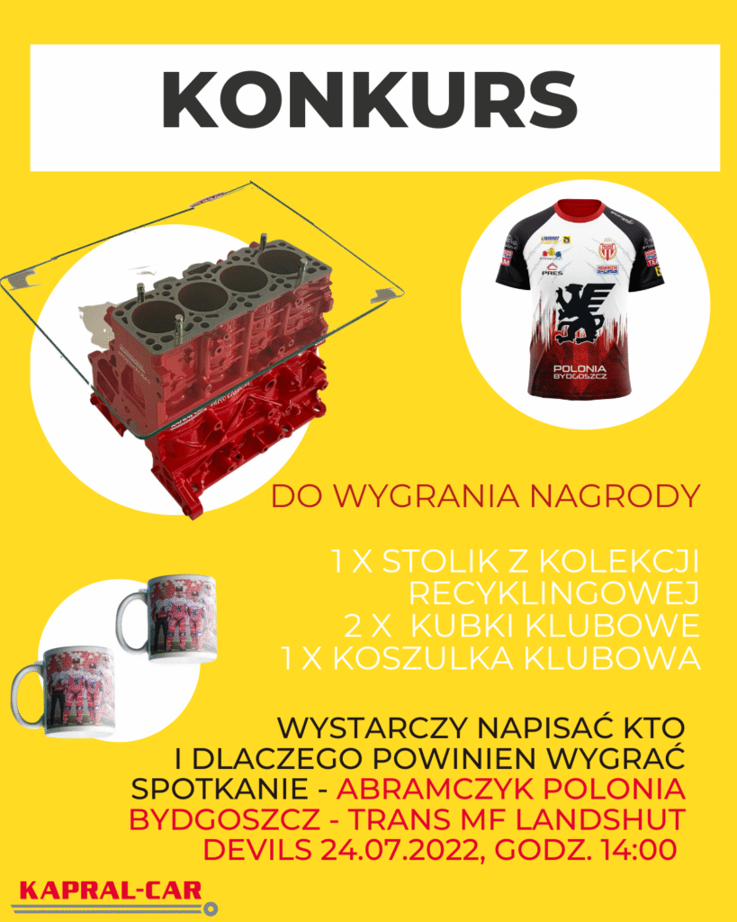 e. Przedmiotem Konkursu jest udzielenie poprawnej odpowiedzi na pytanie konkursowe: „Jakim wynikiem ze. Przedmiotem Konkursu jest udzielenie odpowiedzi na pytanie konkursowe: „ Która drużyna i dlaczego powinna wygrać mecz Abramczyk Polonia Bydgoszcz - Trans MF Landshut Devils 24.07.2022, godz. 14:00?“, zadane w poście na profilu Facebook Stacji demontażu Kapral-Car https://www.facebook.com/kapral.car w formie komentarza pod postem konkursowym (dalej: Zgłoszenie).